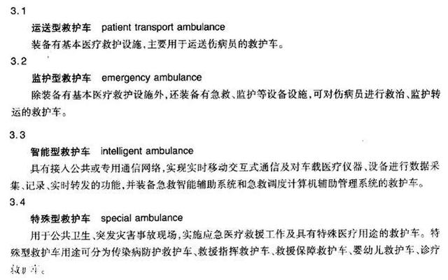 國(guó)家質(zhì)量監(jiān)督檢驗(yàn)檢疫總局發(fā)布的GB/T 17350-2009《專用汽車(chē)和專用掛車(chē)術(shù)語(yǔ)、代號(hào)和編制方法》、工信部2014年3月1日實(shí)施的QC/T 457-2013《救護(hù)車(chē)》、衛(wèi)生部2008年4月1日實(shí)施的WS/T 292-2008《救護(hù)車(chē)》,都對(duì)救護(hù)車(chē)有著各自的定義。