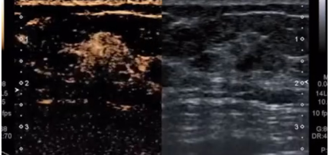 乳腺檢查新技術(shù),包括了三維超聲,超聲造影以及彈性成像技術(shù)。說到三維超聲,大家可能比較熟悉的是胎兒的三維超聲。其實(shí)這種技術(shù)也廣泛應(yīng)用在乳腺癌診斷上。乳腺癌的三維超聲圖像呈太陽光芒征,跟二維圖像對比。直觀顯示了腫瘤對周圍組織的浸潤改變,超聲造影是通過靜脈注射超聲造影劑。來增強(qiáng)人體的血流信號,可以實(shí)時動態(tài)地觀察組織的微血管灌注信息。提高對病變的檢測率和對病變的良性、惡性腫瘤進(jìn)行鑒別。超聲造影表現(xiàn)為不均勻增強(qiáng),病灶造影測值增大。是典型的乳腺癌超聲造影表現(xiàn)。