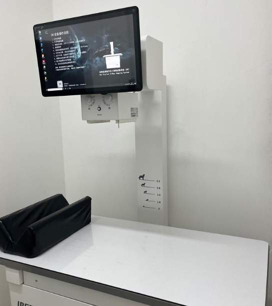 這就是寵物專用的寵物DR影像系統(tǒng),檢查設(shè)備非常重要。快速判斷病情DR系統(tǒng)由于它成像快的優(yōu)點(diǎn),現(xiàn)在已經(jīng)在寵物醫(yī)院廣泛的使用的儀器設(shè)備。都是比較有實(shí)力的寵物醫(yī)院。可以在動物動態(tài)情況下進(jìn)行DR攝片檢查。DR的作用在臨床中拍片子,可以看有沒骨折、有沒有膀胱石,有幾個胎兒等等,DR的手術(shù)床可以活動的方便我們中間去選位置,可以跟這個大小調(diào)整位置。鉛衣是做拍攝防護(hù)的,選擇拍攝部位,腿部、胸部、前肢等。不同部位的值也是不一樣的。千伏毫秒都不一樣。
