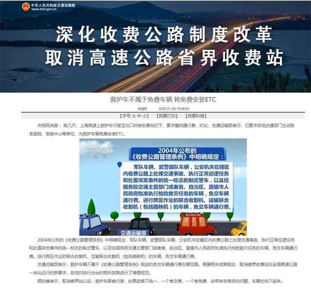 報道稱: 央視網(wǎng)消息 :前幾天,上海高速上救護車行駛至出口時被收費站攔下,要求繳納通行費,對此,交通運輸部表示,已要求各地交通部門主動聯(lián)系醫(yī)院、急救中心等單位,為救護車輛免費安裝ETC。 2004年公布的《收費公路管理條例》中明確規(guī)定,軍隊車輛、武警部隊車輛,公安機關在轄區(qū)內(nèi)收費公路上處理交通事故、執(zhí)行正常巡邏任務和處置突發(fā)事件的統(tǒng)一標志的制式警車,以及經(jīng)國務院交通主管部門或者省、自治區(qū)、直轄市人民政府批準執(zhí)行搶險救災任務的車輛,免交車輛通行費。進行跨區(qū)作業(yè)的聯(lián)合收割機、運輸聯(lián)合收割機(包括插秧機)的車輛,免交車輛通行費。 交通運輸部表示,救護車輛不屬于《收費公路管理條例》規(guī)定的免交車輛通行費車輛范圍。根據(jù)相關政策規(guī)定,取消省界收費站后全國高速公路一體化運行的新要求,各地對自行出臺的相關政策進行了清理規(guī)范。 顧志峰表示,取消省界站以后,救護車跨省行駛,如果政策不統(tǒng)一,一個省交費,一個省免費,會帶來非常多的問題,車輛也快不起來。